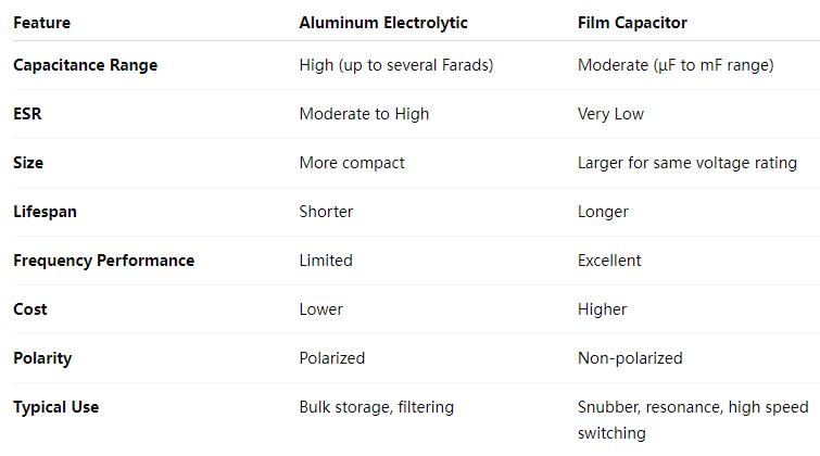 신뢰성은 애플리케이션의 전기적 스트레스, 열 순환 및 환경 조건의 영향을 받습니다. 필름 커패시터는 우수한 수명과 신뢰성을 제공하는 경향이 있는 반면, 알루미늄 전해액은 원하는 서비스 수명을 달성하기 위해 작동 조건을 더욱 신중하게 고려해야 합니다.